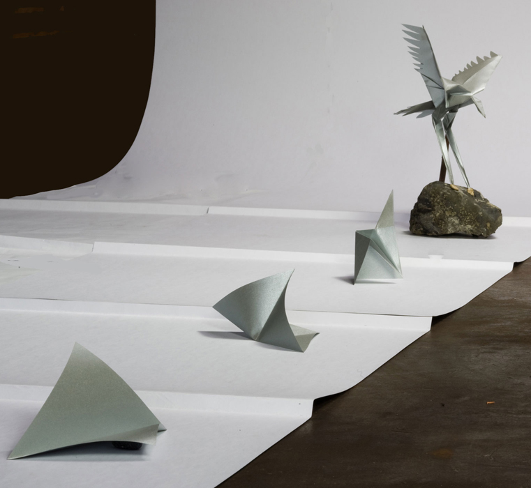 Folded Flight is both an earthwork as well as a sequential sculpture. The flat plain of the landscape is folded horizontally creating one foot accordion folds that relax back to grade level before folding again. This folding is repeated four times. There are four sculptural elements one preceding each fold. The first, a simple fold, creates a butterfly. The second fold begins to give a spiral flight. The third turns inside out on itself and the fourth is the crane, the egret in flight. The site is 75' W by 300' L with the height of the egret at 24'. Semi-Finalist Proposal for the City of Stapleton, CO. Keefer ($300,000) 2010.