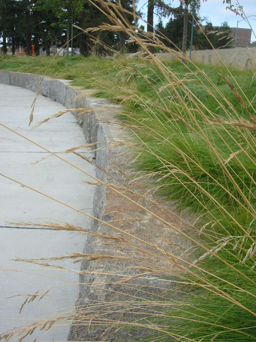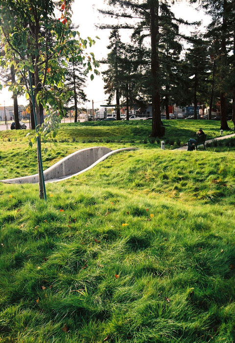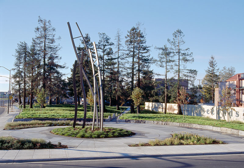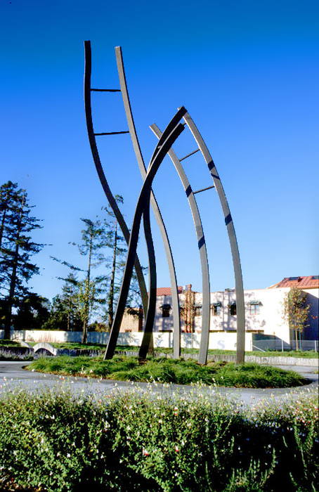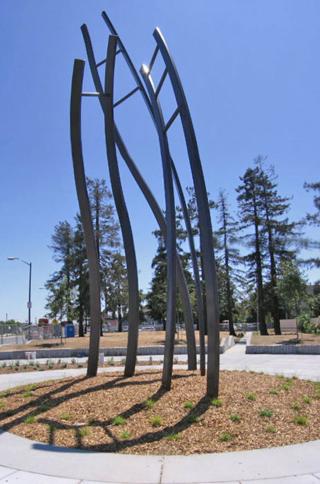 The Loma Prieto Earthquake Memorial is an earthwork, steel ladders and granite benches, in a one acre park located in West Oakland, CA. It was commissioned to commemorate the collapse of the Cypress Freeway and celebrate the community response. The three twisting steel ladders (28' H) symbolize the ladders members of the community threw up against the collapsed freeway to rescue people trapped between the decks. The land has been sculpted into waves to show how the earth moved during the quake. There is informational signage about earthquakes and the Loma Prieto Earthquake in particular. Keefer, Gillman, and APDW. ($680,000) 2005.